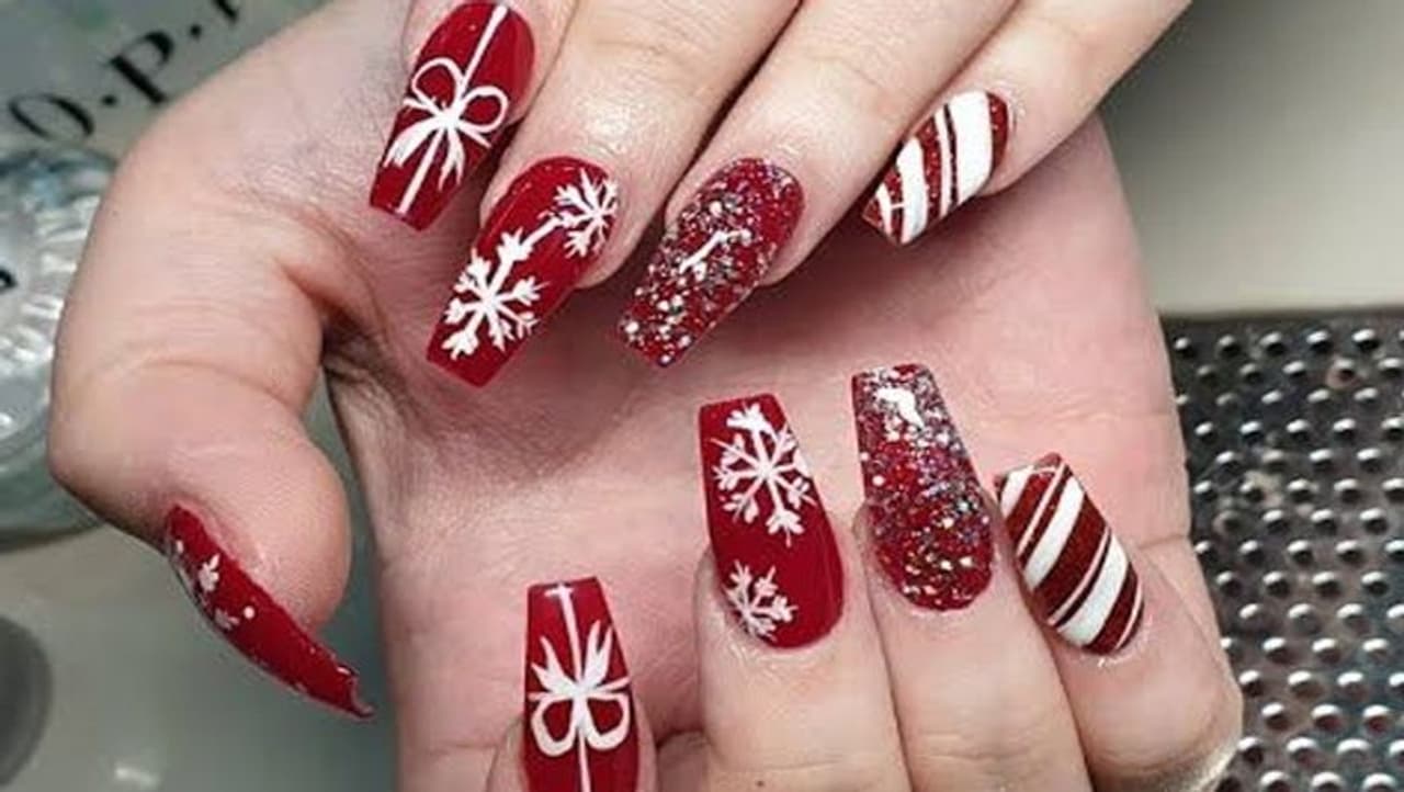 क्रिसमस के मौके पर आप इस तरीके का खूबसूरत रेड और वाइट कलर का इस्तेमाल करते हुए ने नेल आर्ट कर सकते हैं। इसमें हर फिंगर में अलग तरीके का डिजाइन बना हुआ है।