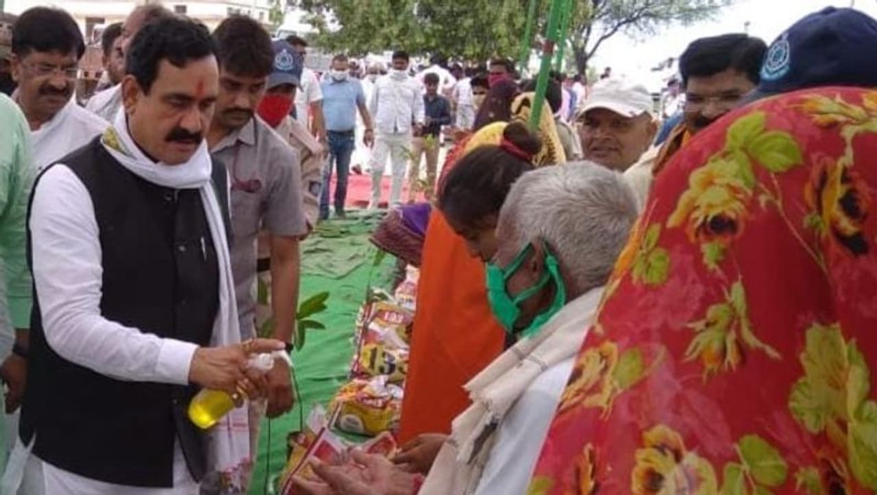 MP के गृहमंत्री की हैरान करने वाली तस्वीरें, जनता को बांट रहे सैनेटाइजर,लेकिन खुद नहीं लगा रहे मास्क