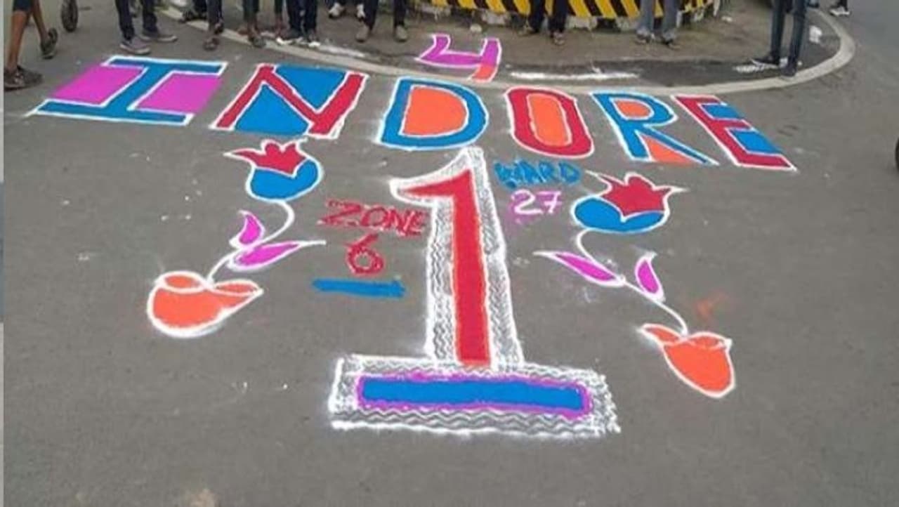 इंदौर सफाई में नंबर 1 आने पर शहर के लोगों ने सड़कों पर जगह-जगह रंगोली बनाकर जश्न मनाया।