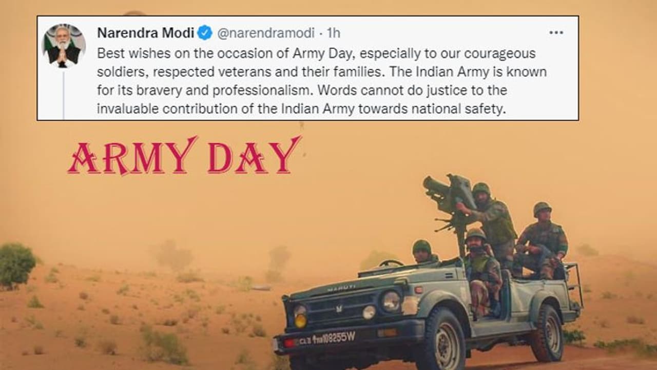 मोदी ने tweet करके लिखा-"सेना दिवस के अवसर पर, विशेष रूप से हमारे साहसी सैनिकों, सम्मानित दिग्गजों और उनके परिवारों को शुभकामनाएं। भारतीय सेना अपनी बहादुरी और पेशेवराना अंदाज के लिए जानी जाती है। राष्ट्रीय सुरक्षा की दिशा में भारतीय सेना के अमूल्य योगदान को शब्दों से बयां नहीं किया जा सकता है।
