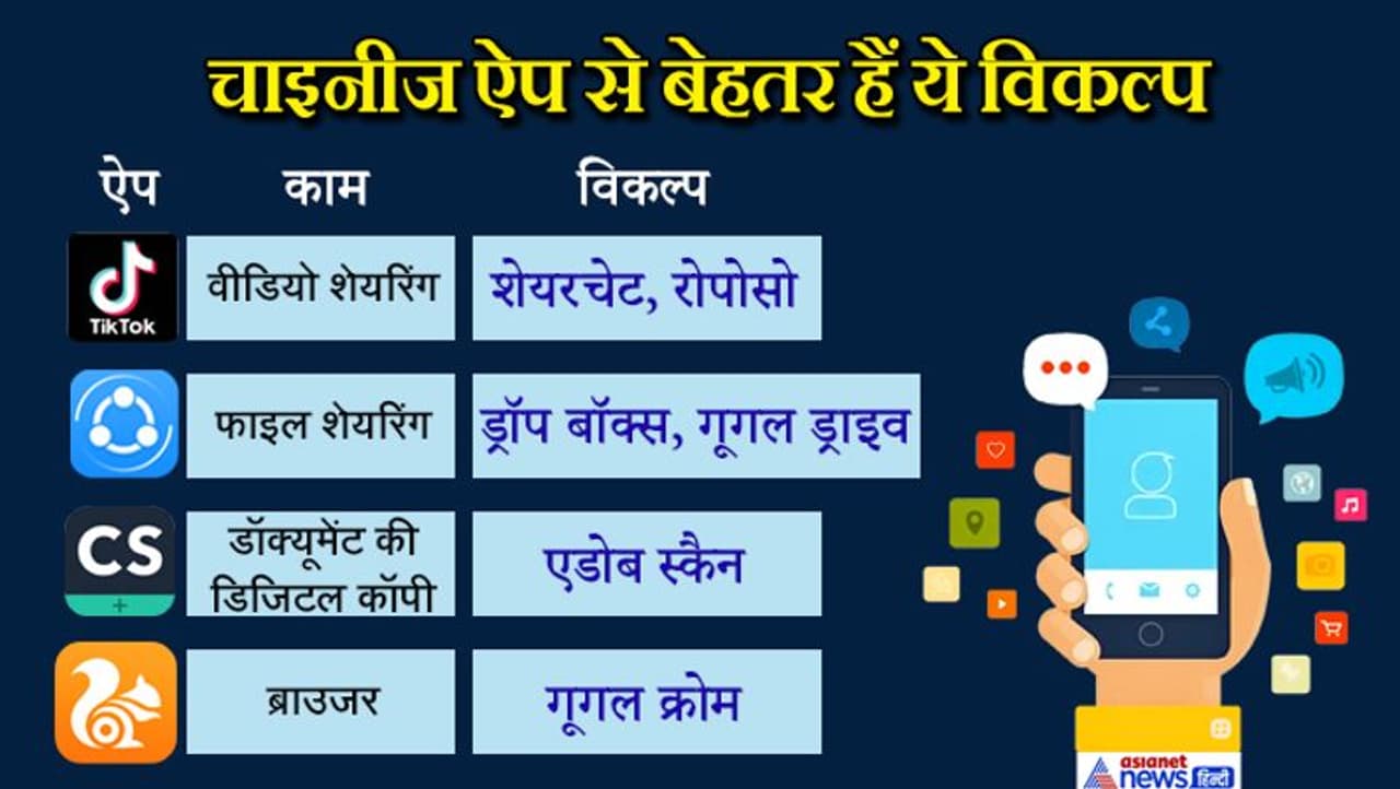 नई दिल्ली. भारत सरकार ने TikTok, Share IT और UC Browser जैसे 59 ऐप बैन कर दिए हैं। ये ऐप भारत में काफी प्रचलित थे। भारत सरकार ने जिन 59 ऐप को बैन किया है, उनमें से ज्यादातर यूटिलिटी सेवाएं दे रही थीं। ऐसे में इन ऐप के बैन होने पर आपको जल्द से जल्द इनके विकल्पों की जरूरत होगी। आईए हम आपको कुछ जरूरी ऐप के विकल्प बता रहे हैं...