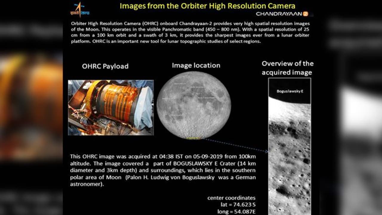 इसरो ने ऑर्बिटर हाई रिजोल्यूशन कैमरे से ली गई तस्वीर जारी की है. ऑर्बिटर हाई रिजोल्यूशन कैमरे (OHRC) चंद्रमा की सतह पर चंद्रयान-2 की हाई रिजोल्यूशन तस्वीरें मुहैया कराता है। जो पैंक्रोमैटिक बैंड (450-800 nm) पर संचालित होता है।