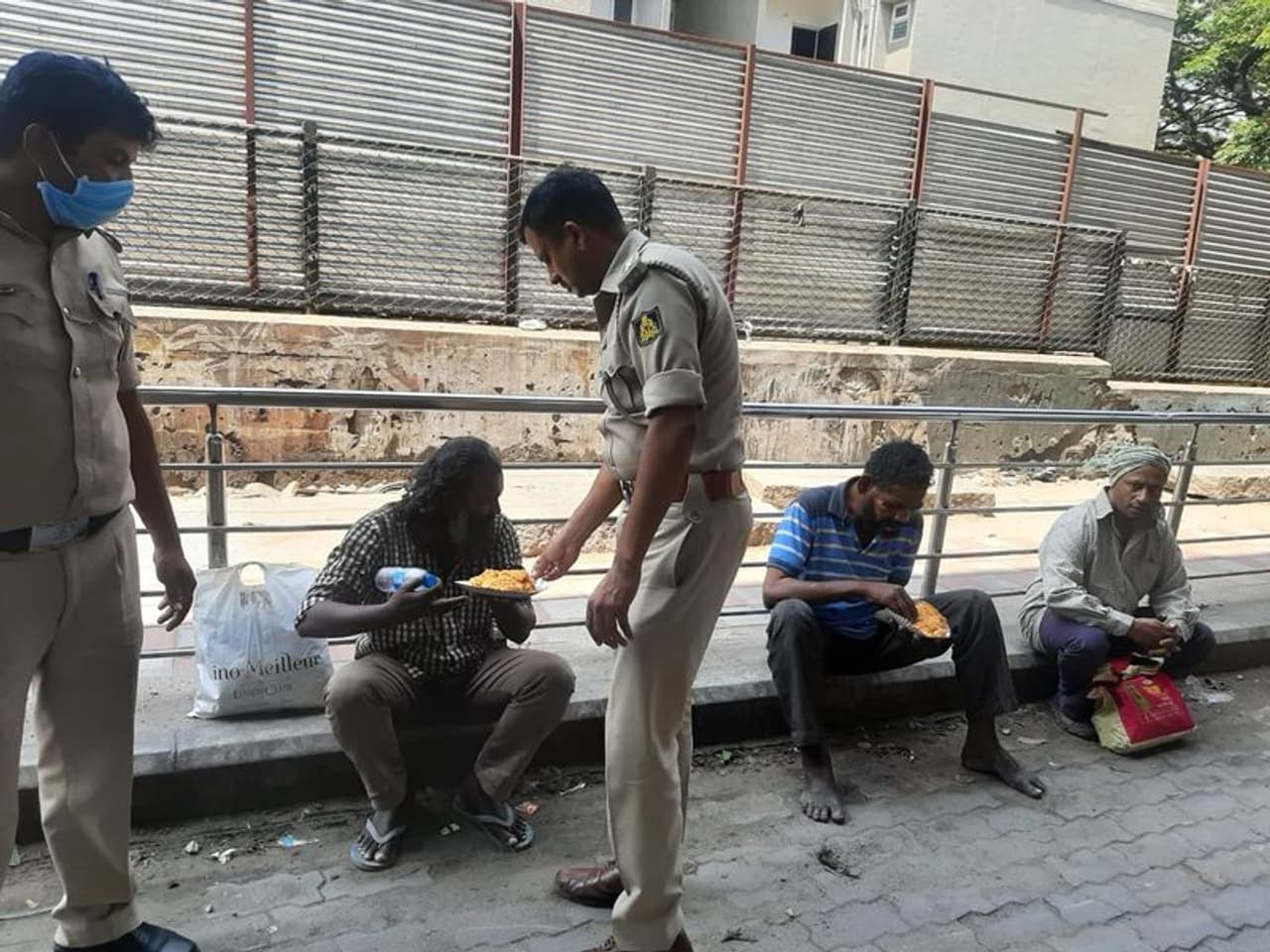 प्रधानमंत्री नरेंद्र मोदी ने कहा, लोगों को लॉकडाउन के वक्त बिल्कुल भी परेशान होने की जरूरत नहीं है। सभी जरूरी सामान हमेशा उपलब्ध रहेगा। (बेंगलुरु में गरीबों और जरूरतमंदों को खाना देते पुलिस कर्मी।)