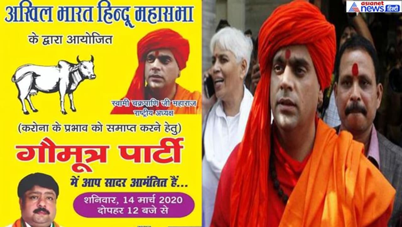 अखिल भारतीय हिंदू महासभा के राष्ट्रीय अध्यक्ष स्वामी चक्रपाणि अपने विवादित बयानों की वजह से चर्चा में रहते हैं। अब वो कोरोना को भगाने के लिए गौमूत्र पार्टी कर रहे हैं जिससे लोग इस जानलेवा वायरस के बारे में जान सकें।
