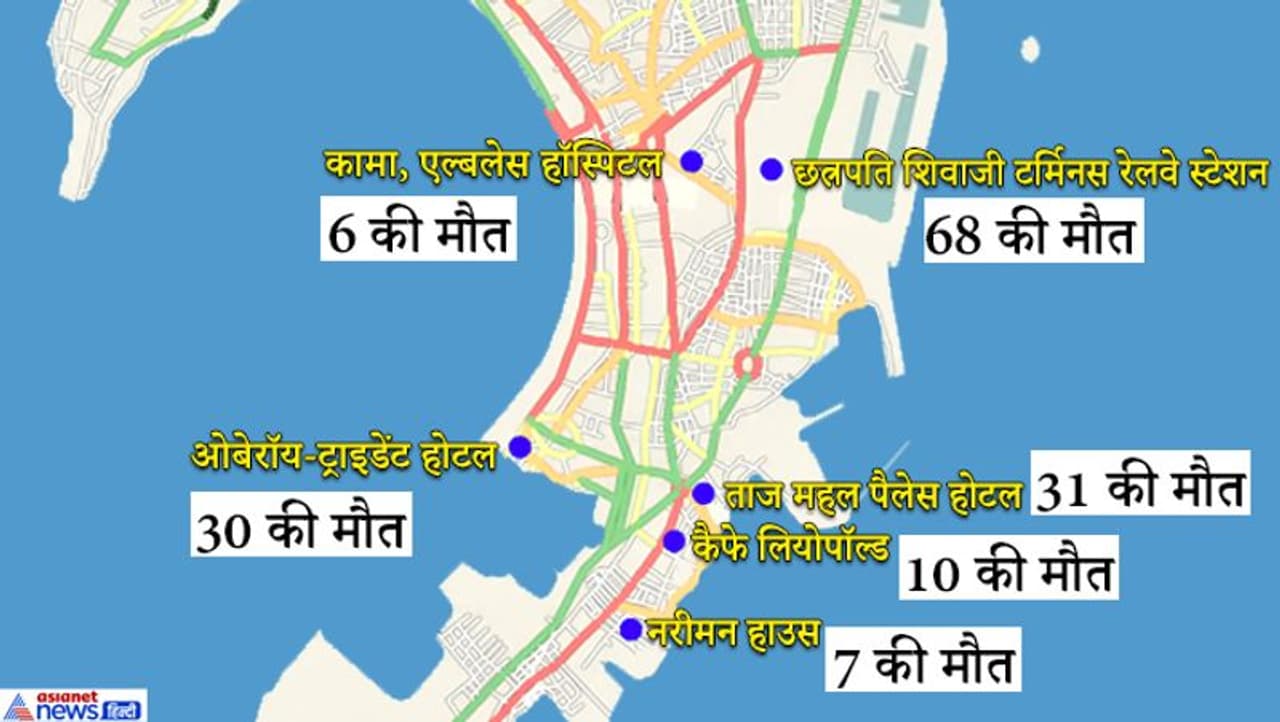 हमला लश्कर-ए-तैयबा के 10 आतंकियों ने किया था। नाकाम करने में हमारे कई बहादुर जवान शहीद हुए थे। 26 विदेशी नागरिकों समेत 166 बेगुनाह लोगों को अलग-अलग जगहों पर जान गंवानी पड़ी। हालांकि 10 में से 9 आतंकी मुठभेड़ में बुरी मौत मारे गए। एक आतंकी जिंदा पकड़ा गया था जो अदालत से फांसी की सजा पाने के बाद मौत के घाट उतरा। इस हमले के कुछ गुनहगार आज भी पाकिस्तान में खुल्ला घूम रहे हैं। 26/11 की बरसी के मौके पर आपको बताते हैं आतंकियों ने किन-किन जगहों पर हमला किया था और कहां कितने बेगुनाह मारे गए थे।
