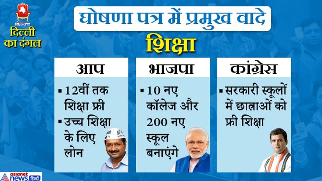 शिक्षा- जहां आप ने 12वीं तक फ्री शिक्षा का वादा किया है। वहीं, भाजपा ने छात्राओं को स्कूटी और साइकिल देने का वादा किया है। वहीं, कांग्रेस ने सरकारी स्कूलों में छात्राओं को फ्री शिक्षा का वादा किया है।