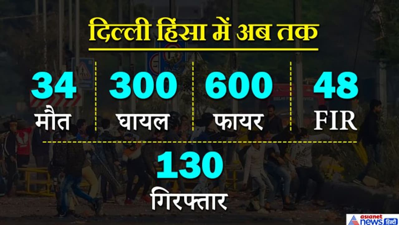 दिल्ली हिंसा पर अब तक 34 की मौत, 300 घायल, 600 फायरिंग, 48 FIR और 130 लोगों की गिरफ्तारी हो चुकी है।