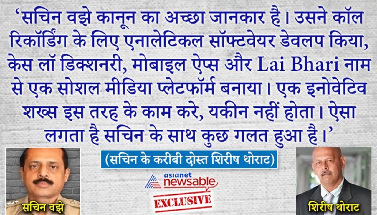 जवाब - सचिन वझे मेरा करीबी दोस्त रहा है। वह उसी समय से मेरा दोस्त रहा है, जब पहली बार हम एकेडमी में मिले थे। मैं पिछले 30 सालों से उसके लगातार संपर्क में रहा हूं। हमने हमेशा एक-दूसरे का सहयोग किया है। हमारी जिंदगी में हमेशा उतार-चढ़ाव आते रहे है। मैं पूरी तरह यह सच्चाई सामने लाना चाहता हूं कि जहां तक साथ में बिजनेस करने का सवाल है, मैं हमेशा पैसिव डायरेक्टर रहा। मैंने कभी भी इन्वेस्टमेंट नहीं किया और न ही मैं शेयरहोल्डर रहा। मैंने बतौर दोस्त उसकी मदद की, जो अपनी आजीविका के लिए संघर्ष कर रहा था। वह कभी एक सफल बिजनेसमैन नहीं रहा। हालांकि, उसने कई तरह के कारोबार में हाथ आजमाया, लेकिन उसे सक्सेस नहीं मिली। वझे को कानून की बहुत अच्छी जानकारी है। वह काफी इनोवेटिव है। उसने कई कॉपीराइट अपने नाम किए। उसने कॉल रिकॉर्डिंग के लिए एनालेटिकल सॉफ्टवेयर डेवलप किया। उसने केस लॉ डिक्शनरी तैयार की। मेरे साथ मिलकर उसने कुछ मोबाइल ऐप्स डेवलप किए, जो लॉ एन्फोर्समेंट में सहायक थे। उसने भारतीय फेसबुक की तरह एक सोशल मीडिया प्लेटफॉर्म भी विकसित किया, जिसका नाम 'लाई भरी' (Lai Bhari) रखा गया। यह काफी हद तक सफल रहा। इससे जाहिर होता है कि वझे काफी इंटेलिजेंट है। ऐसा शख्स इस तरह के काम करे, इस पर एकबारगी यकीन नहीं होता। मैं इस तरह का काम करने वाले व्यक्ति का समर्थन नहीं कर सकता। लेकिन इस बात में कोई शक नहीं है कि सचिन वझे के साथ कुछ गलत हुआ है।
