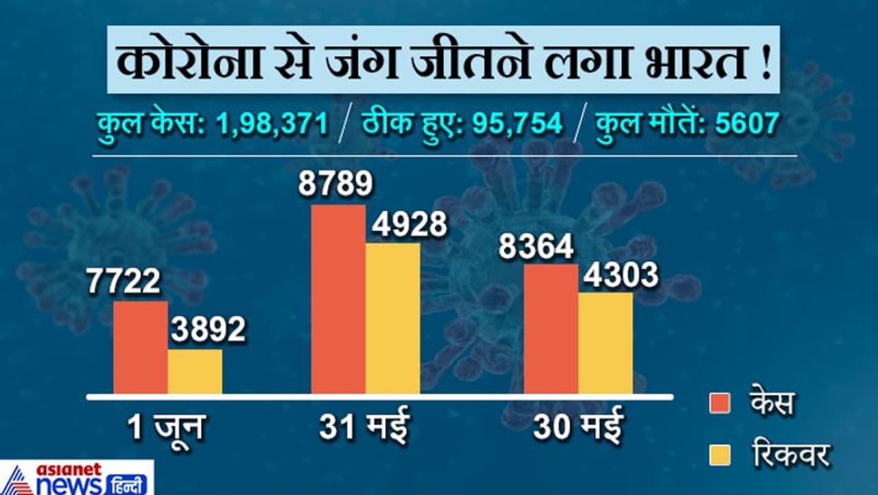 देश में अभी 97 हजार 581 एक्टिव केस हैं। जबकि 95 हजार 526 लोग कोरोना को हराकर घर जा चुके हैं। पिछले 24 घंटे में 4,835 लोगों को अस्पतालों से छुट्टी दी गई है। केंद्र सरकार के 8 मई के गाइडलाइंस के मुताबिक, हल्के और मध्यम कोरोना पीड़ित मरीजों में अगर लक्षण नहीं बढ़ते हैं तो उसे 10 दिन बाद स्वस्थ घोषित कर दिया जा रहा। यानी आने वाले समय में कोरोना से ठीक होने वाले लोगों की संख्या और तेजी से बढ़ेगी।