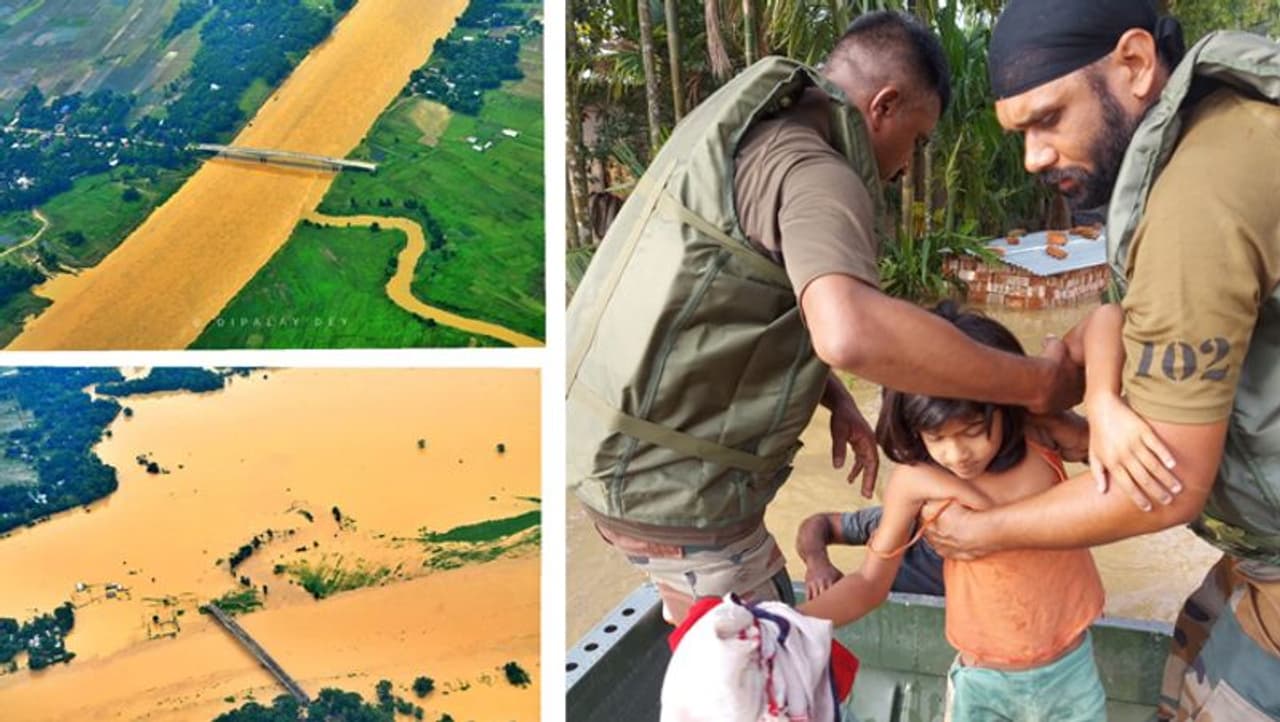 पहली तस्वीर असम की बराक घाटी में स्थित बद्री ब्रिज(Badri Bridge) की है। फोटो क्रेडिट-Dipalay dev। जबकि दूसरी तस्वीर में सेना के जवान रेस्क्यू करते हुए।