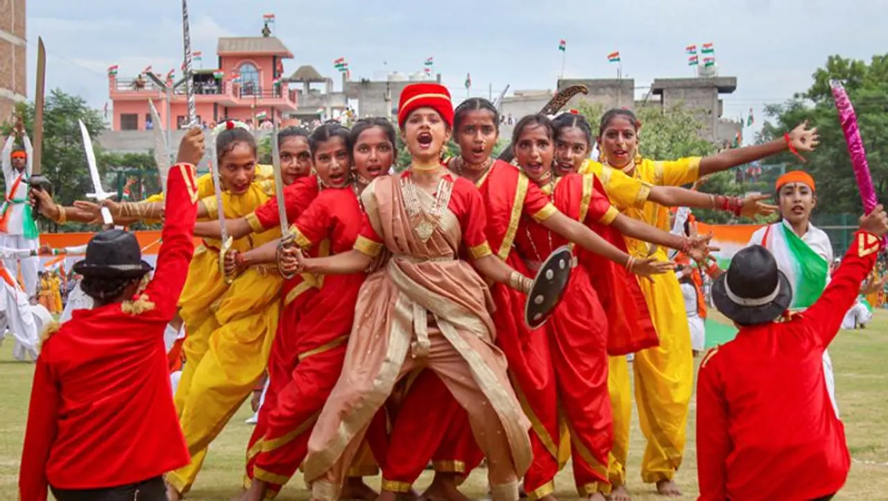 76वें स्वतंत्रता दिवस के अवसर पर गुरुग्राम में आयोजित सांस्कृतिक कार्यक्रम के दौरान प्रस्तुति देते स्टूडेंट। इस दौरान एक स्टूडेंट ने झांसी की रानी लक्ष्मीबाई का किरदार निभाया।