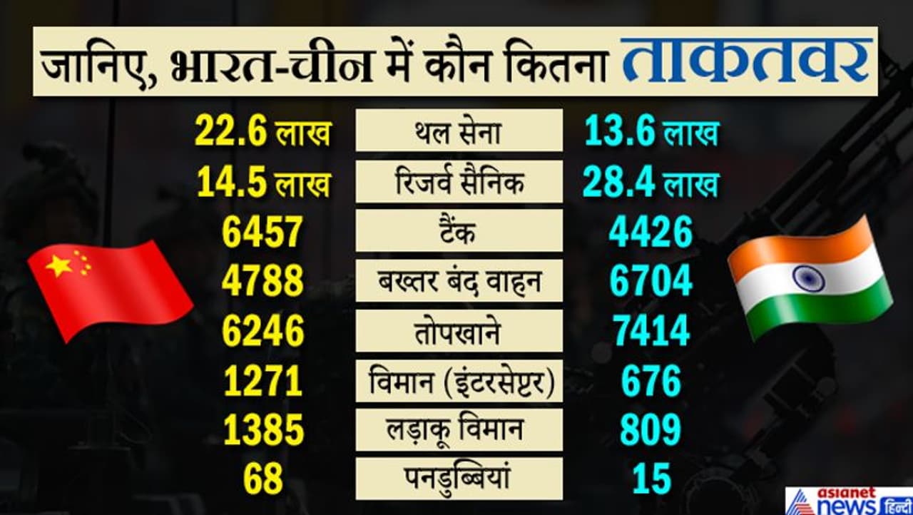 ग्लोबल फायरपावर वेबसाइट के मुताबिक, भारत के पास कुल 42.07 लाख सैनिक हैं। जबकि चीन के पास 37.12 लाख सैनिक हैं। थल सेना के टैंक्स की बात करें तो चीन इस मामले में भारत से आगे हैं। चीन के पास 6457 युद्धक टैंक्स हैं। जबकि भारतीय सेना के पास ऐसे 4426 टैंक हैं। अगर कागजी आंकड़ों को छोड़ें तो भारत के पास चीन के मुकाबले कई बड़े टैंक्स बॉर्डर पर तैनात हैं। इतना ही नहीं भारत के पास बख्तरबंद लड़ाकू वाहन 6704 हैं, वहीं, चीन के पास ऐसे 4788 वाहन हैं। तोपखानों के मामले में भी भारत चीन से आगे हैं। चीन के पास 6246 तोपखाने हैं, वहीं, 7414 तोपखाने हैं।