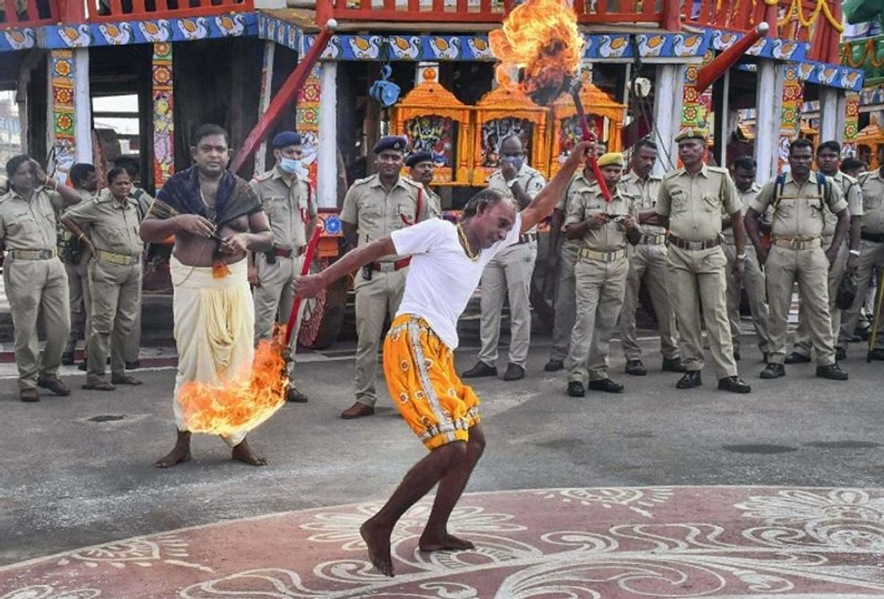 पुरी में भगवान जगन्नाथ की रथ यात्रा की शुरुआत के दौरान इस भक्त ने मशालों के साथ नृत्य किया। देश-विदेश से हजारों भक्त रथ यात्रा में शामिल होने पुरी पहुंचे हैं।