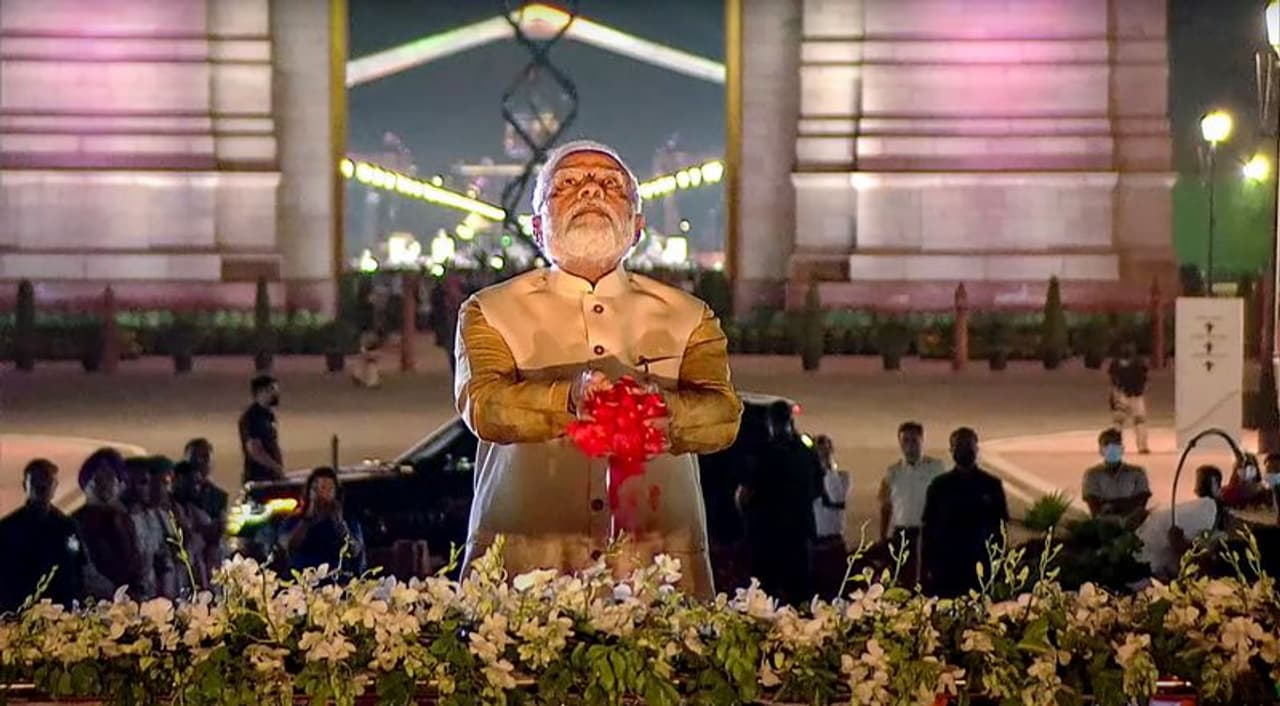पीएम मोदी ने कहा कि आज भारत के आदर्श अपने हैं, आयाम अपने हैं। आज भारत के संकल्प अपने हैं, लक्ष्य अपने हैं। आज हमारे पथ अपने हैं, प्रतीक अपने हैं। उन्होंने कहा कि आज अगर राजपथ का अस्तित्व समाप्त होकर कर्तव्यपथ बना है, आज अगर जॉर्ज पंचम की मूर्ति के निशान को हटाकर नेताजी की मूर्ति लगी है, तो ये गुलामी की मानसिकता के परित्याग का पहला उदाहरण नहीं है। ये न शुरुआत है, न अंत है। ये मन और मानस की आजादी का लक्ष्य हासिल करने तक, निरंतर चलने वाली संकल्प यात्रा है।