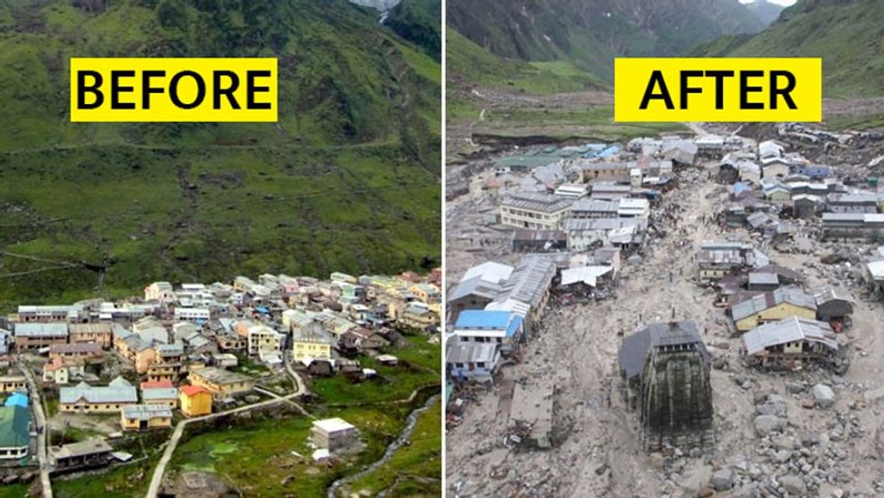 केदारनाथ में तबाही से पहले और बाद की तस्वीरें साफ दिखा रही हैं कि आसपास के क्षेत्रों में बाढ़ की वजह से कितना नुकसान हुआ। हालांकि, इतनी बाढ़ के बावजूद मंदिर को ज्यादा नुकसान नहीं हुआ था।