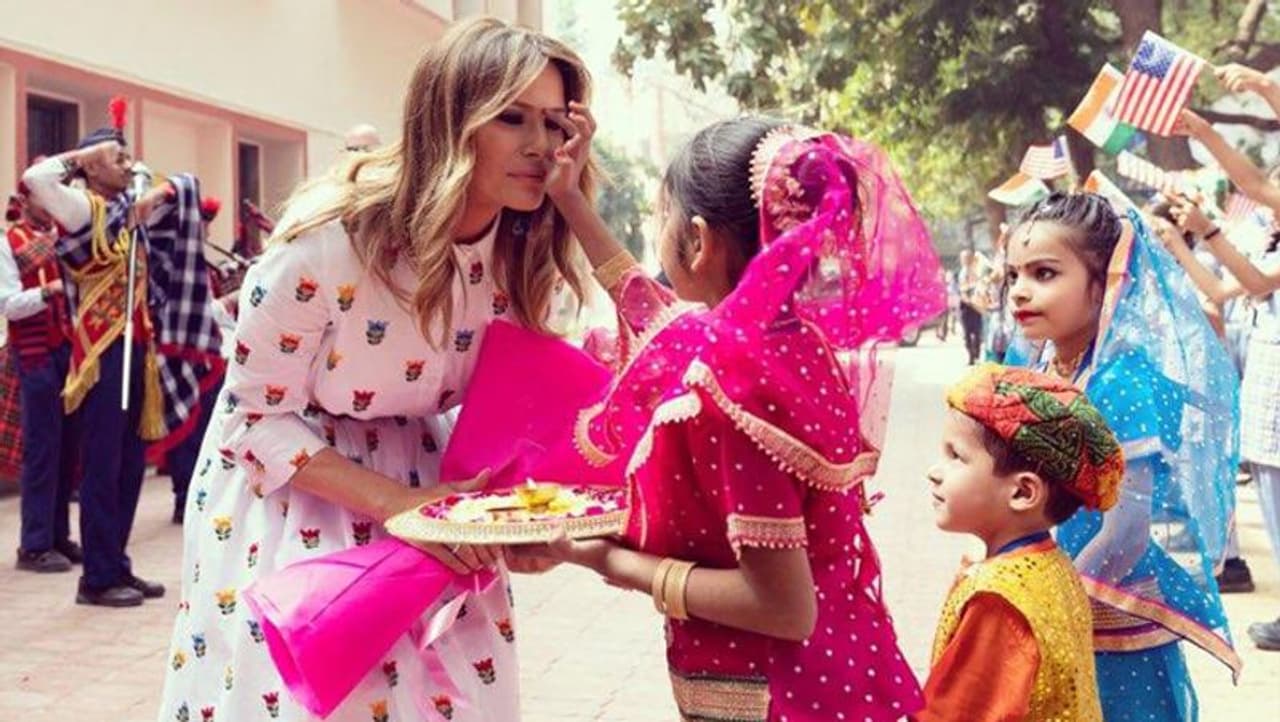 अमेरिका की फर्स्ट लेडी मेलानिया ट्रम्प मंगलवार को दिल्ली के सरकारी स्कूल में पहुंचीं थीं। यहां उन्होंने हैपिनेस क्लास का दौरा किया था। यहां मेलानिया का परंपरागत तरीके से स्वागत किया गया था। बच्चों ने मेलानिया का तिलक लगाकर स्वागत किया।