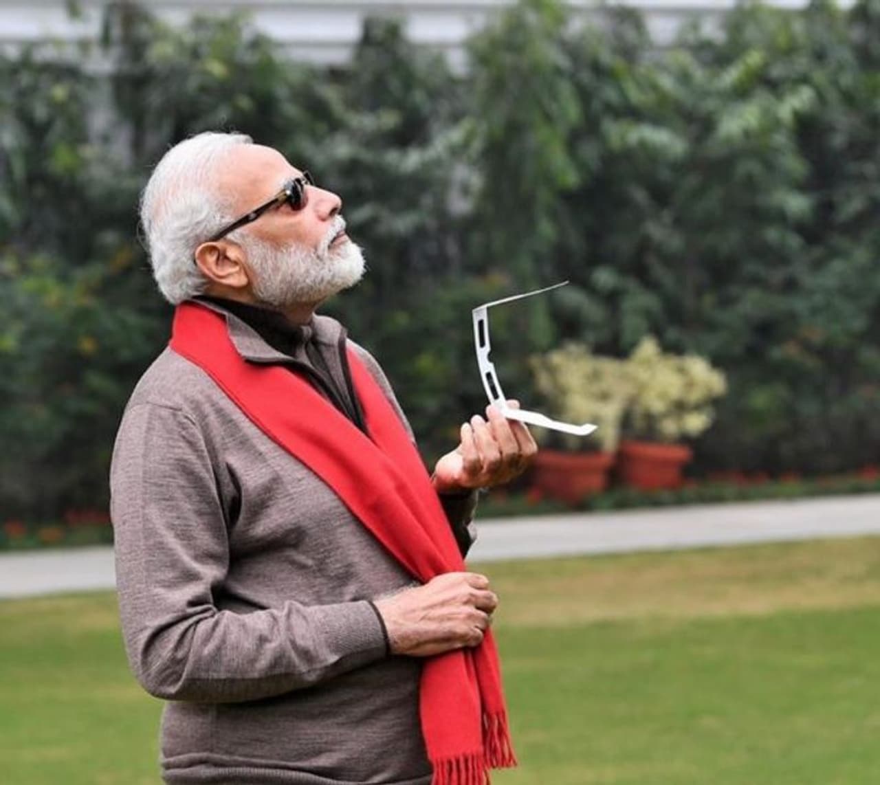 सूर्यग्रहण के दौरान लाल मफलर और काले चश्मे में पीएम मोदी।