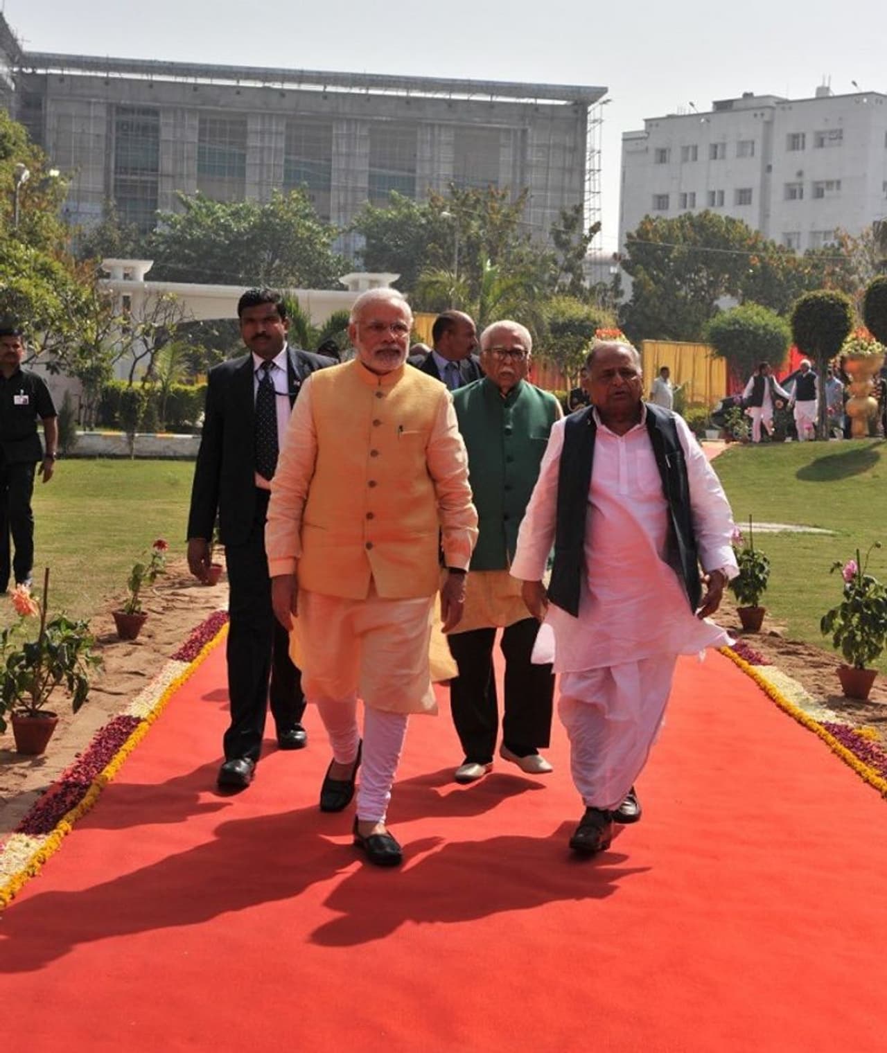 बात 2017 की है। योगी आदित्यनाथ यूपी के सीएम पद की शपथ ले रहे थे। समारोह में प्रधानमंत्री नरेंद्र मोदी शामिल थे। मुलायम सिंह यादव और अखिलेश यादव भी वहां मौजूद थे। मुलायम सिंह ने अपने बेटे अखिलेश की ओर इशारा करते हुए नरेंद्र मोदी से कान में कुछ कहा था। यह फोटो वायरल हो गया था।