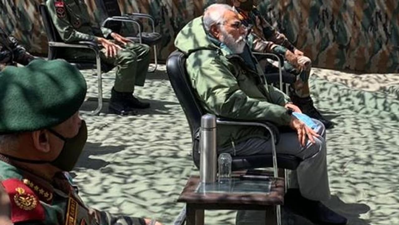 लेह में पीएम मोदी को सुनने के लिए सेना सोशल डिस्टेंसिंग का पालन करते हुए दूर-दूर बैठे हुए थे।