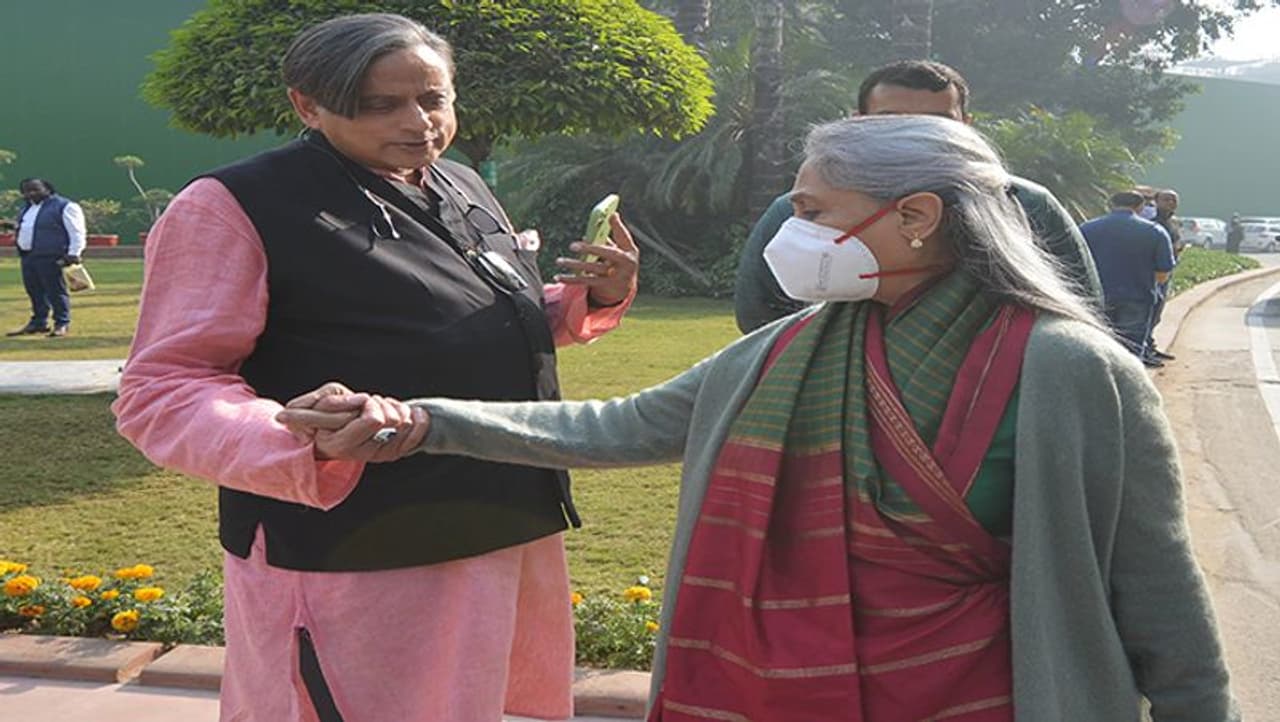 सदन के आखिरी दिन कांग्रेस सांसद शशि थरूर सपा सांसद जया बच्चन के साथ। दोनों एक दूसरे का हाथ पकड़े ऐसे नजर आए जैसे भाजपा के खिलाफ एकजुटता का अहसास करा रहे हों। सोमवार को राज्यसभा में नारकोटिक ड्रग्स और साइकोट्रॉपिक पदार्थ (संशोधन) विधेयक 2021 पर चर्चा के दौरान जया बच्चन का गुस्सा मोदी सरकार पर फूटा था। उन्होंने सरकार को बुरे दिन आने का शाप तक दे डाला था।