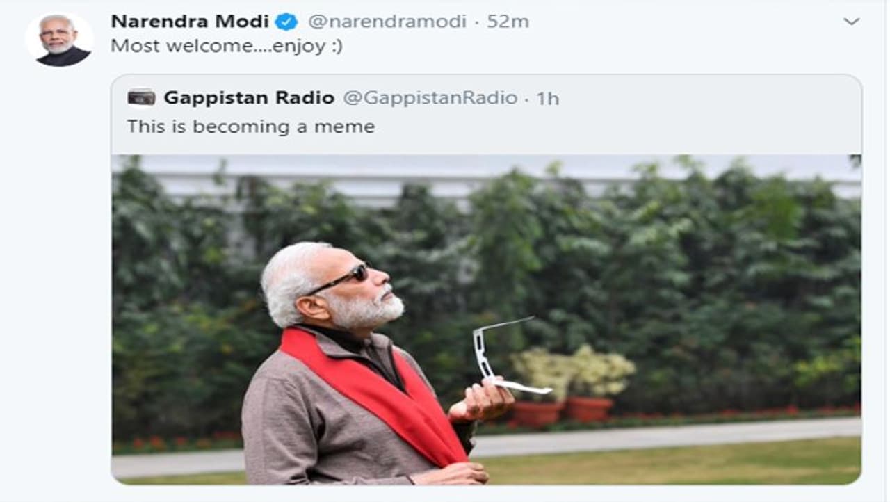 पीएम की फोटो को पोस्ट करते हुए Gappistan Radio ने ट्वीट किया, This is becoming a meme। पीएम मोदी ने इसपर रीट्वीट करते हुए लिखा- मोस्ट वेलकम...एन्जॉय।