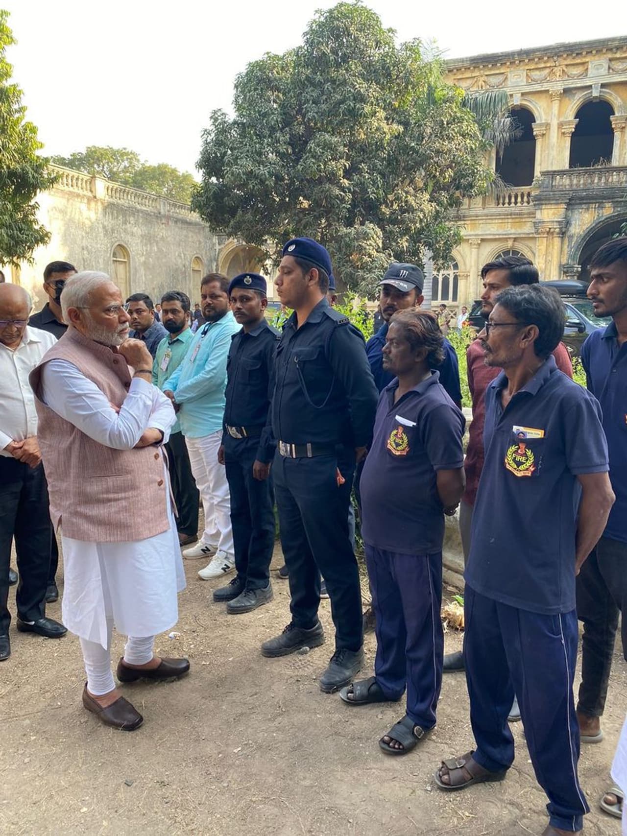 मोरबी पुल गिरने से हुई मौतों के बाद स्थिति का जायजा लेने व शोक संवेदना प्रकट करने के लिए प्रधानमंत्री नरेंद्र मोदी मंगलवार को पहुंचे थे। पीएम नरेंद्र मोदी ने सबसे पहले हादसा स्थल पर पहुंचकर हादसा की पूरी व विस्तृत जानकारी ली। उन्होंने सभी हादसा स्थल देखने के बाद घायलों से मिलने अस्पताल जाने का फैसला किया। घायलों से मिलने के पहले उन्होंने रेस्क्यू में लगी टीमों से मुलाकात की। सैकड़ों जान बचाने वाले इन प्रहरियों का हौसलाआफजाई कर उन्होंने धन्यवाद किया।