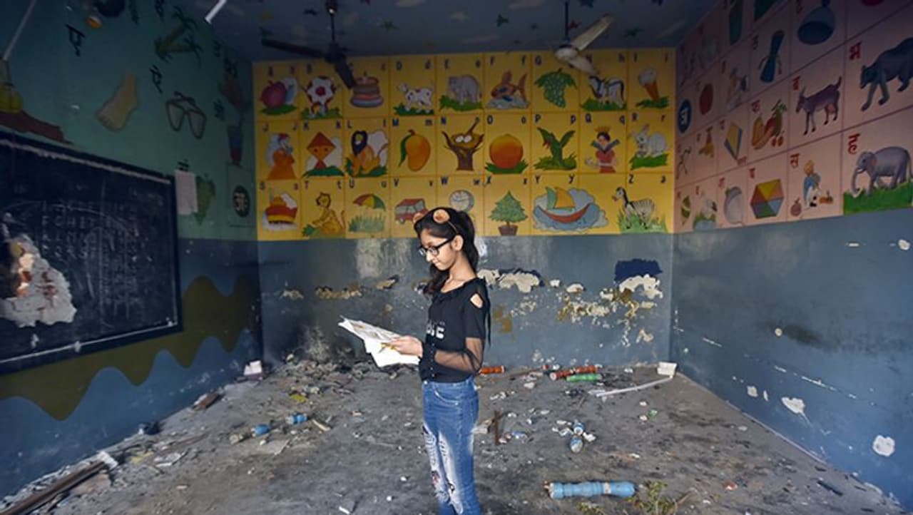 दंगाईयों ने स्कूलों तक में आग लगा दी। उत्तर पूर्वी दिल्ली इलाके के एक स्कूल में बूरी तरह आग लगने के बाद स्थिति को देखती स्कूल में पढ़ने वाली छात्रा।