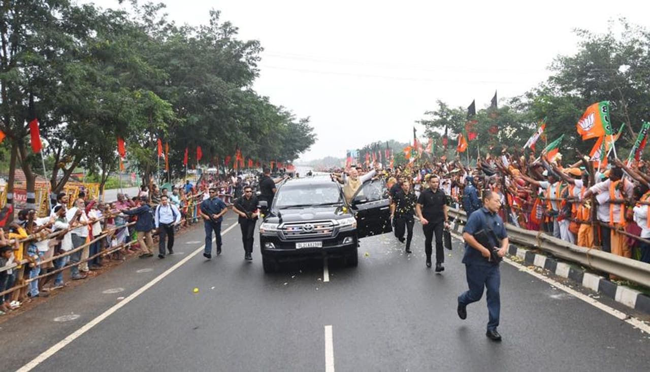 नरेंद्र मोदी को देखने के लिए सड़क किनारे लोगों की भारी भीड़ जुटी थी। भाजपा कार्यकर्ता पार्टी का झंडा लेकर पहुंचे थे।