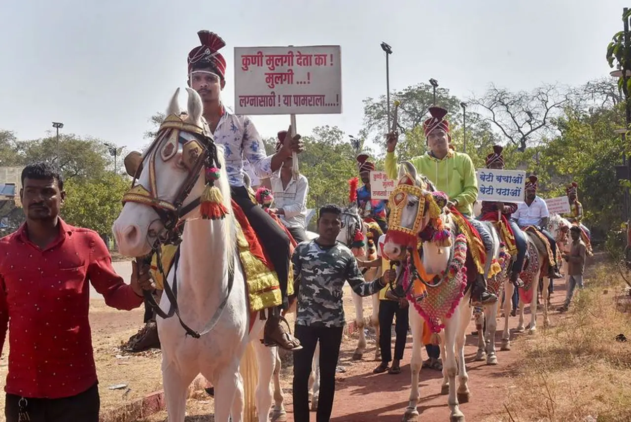 सोलापुर: महाराष्ट्र के सोलापुर में बुधवार, 21 दिसंबर, 2022 को दुल्हन की तरह सजे-धजे घोड़ों पर सवार युवकों ने 'सेव द गर्ल्स' कैम्पेन के लिए यूं रैली निकाली)