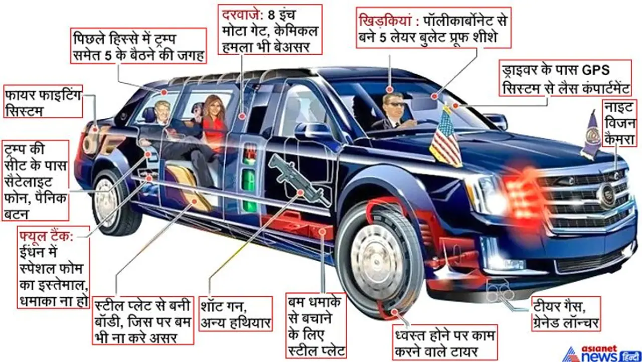 इसमें कितने रक्षा उपकरण रहते हैं? : ट्रम्प की द बीस्ट कार पूरी तरह से रक्षा उपकरणों से लैस रहती है। इसमें आगे शॉटगन, आंसू गैस, ग्रेनेड लॉन्चर, इसके अलावा फायर फाइटिंग सिस्टम और स्मोक स्क्रीन भी है।