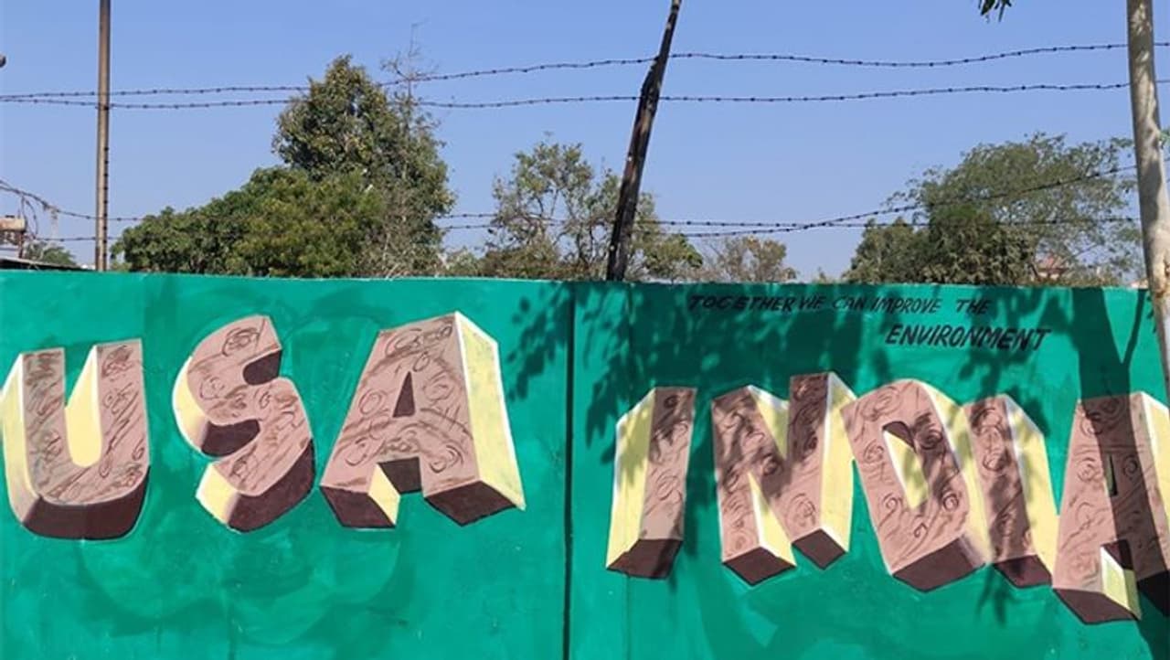 बच्चों से करेंगी मुलाकात, जानेंगी हालः यह पहला मौका होगा, जब दिल्ली के सरकारी स्कूलों में अमेरिका की प्रथम महिला विशेष मेहमान होंगी। इस विशेष दौरे के लिए स्कूल में सभी तैयारियां पूरी कर ली गई है। मेलानिया ट्रंप हैप्पीनेस क्लास में बच्चों के साथ समय बिताएंगी और जानेंगे कि कैसे सरकारी स्कूल के बच्चों के बीच तनाव कम किया जाता है। (फोटो- ट्रंप के स्वागत के लिए दीवारों पर बनाई गई पेंटिंग)