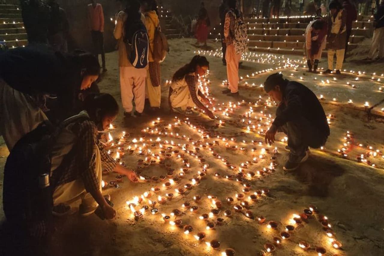अस्सी घाट पर एक बड़े चबूतरे को रंगोली से सजाया गया। यहां पर 'दिन विकासी और भव्य काशी' लिखा गया है। शाम होते ही हर कोई दीप जलाने में जुट गया। सभी गीत भी गाते सुनाई दिए।