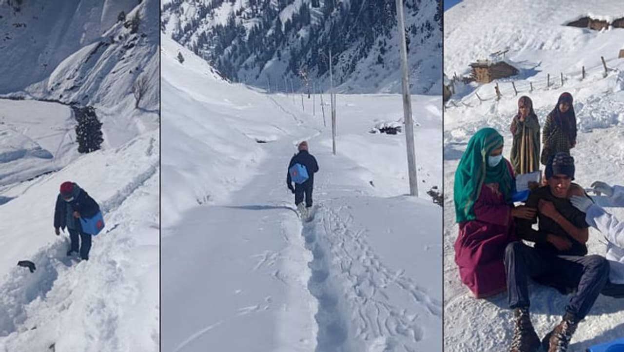 यह तस्वीर Bandipora First(@BandiporaFirst) के twitter पेज से ली गई है। इसमें लिखा गया-उत्तरी कश्मीर की गुरेज घाटी में अत्यधिक ठंड और बर्फबारी का सामना करते हुए 15 से 18 वर्ष के आयु वर्ग के 700 से अधिक बच्चों ने स्वास्थ्य विभाग द्वारा स्थापित स्कूलों और अन्य केंद्रों में अपनी कोविड टीकाकरण खुराक प्राप्त की।