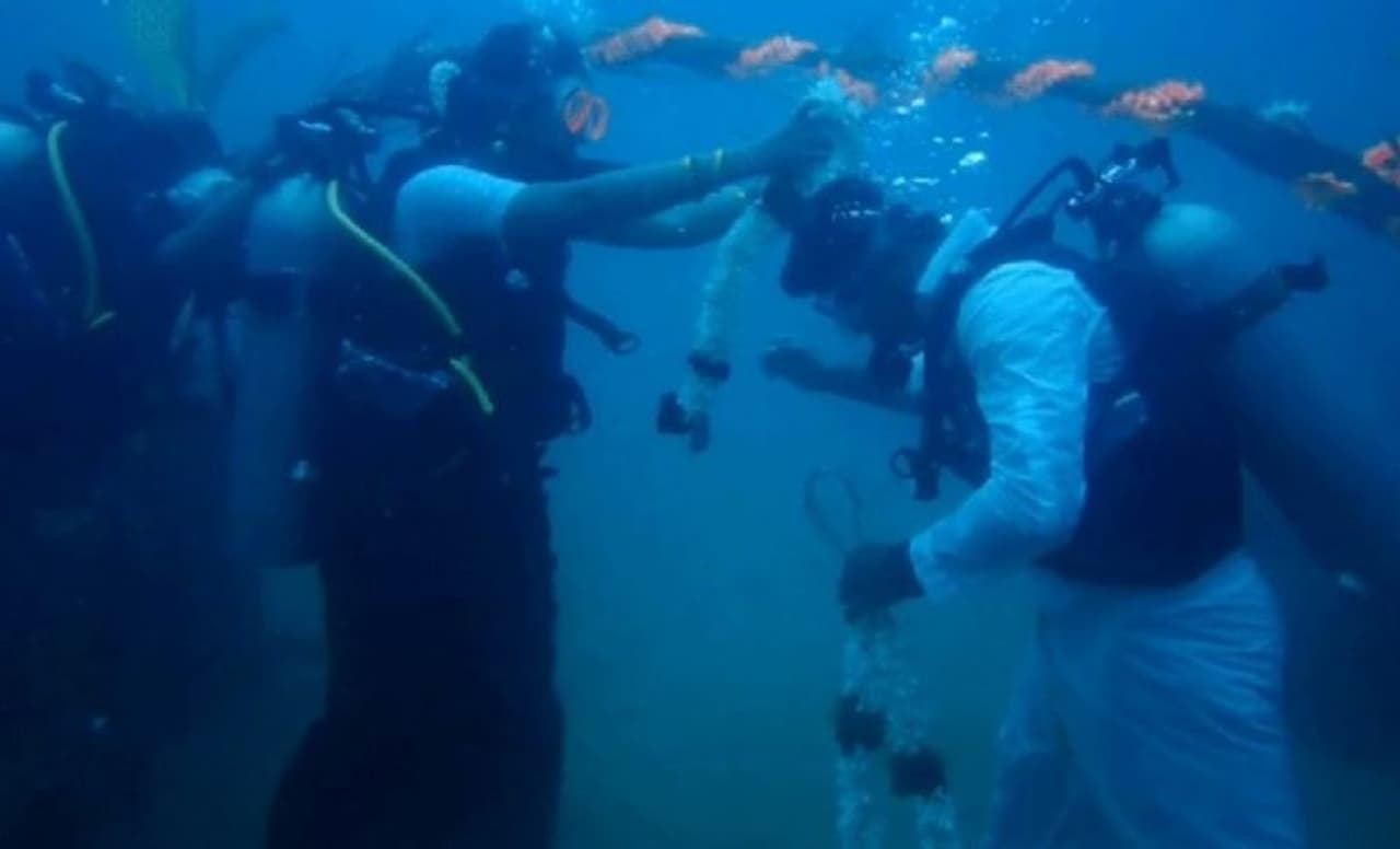 कोयंबटूर (तमिलनाडु). शादी जिंदगी का सबसे महत्वपूर्ण पल होता है। हर कोई अपने विवाह को खास बनाने के लिए कुछ अलग करने की कोशिश करता है। लेकिन, अब हम आपको ऐसी शादी के बारे में बताने जा रहे हैं, जिसे शायद ही आपने कभी देखा या सना होगा। तमिलनाडु के कोयंबटूर में एक कपल ने ऐसी अनोखी शादी की जिसकी चर्चा मीडिया में हो रही है। यहां दूल्हा-दुल्हन ने समुद्र के 60 फीट गहरे पानी में अंदर जाकर एक दूसरे को वरमाला पहनाई और सात फेरे लिए।
