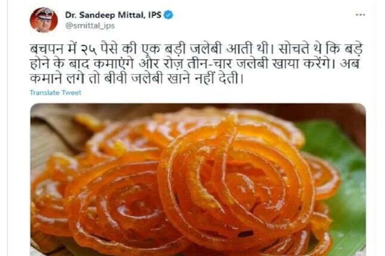 दरअसल, तमिलनाडु के पुलिस अफसर और आईपीएस डॉ. संदीप मित्तल ने 17 जुलाई को ट्विटर पर जलेबी की एक फोटो शेयर कर लिखा-'बचपन में २५ पैसे की एक बड़ी जलेबी आती थी। सोचते थे कि बड़े होने के बाद कमाएंगे और रोज़ तीन-चार जलेबी खाया करेंगे। अब कमाने लगे तो बीवी जलेबी खाने नहीं देती'।