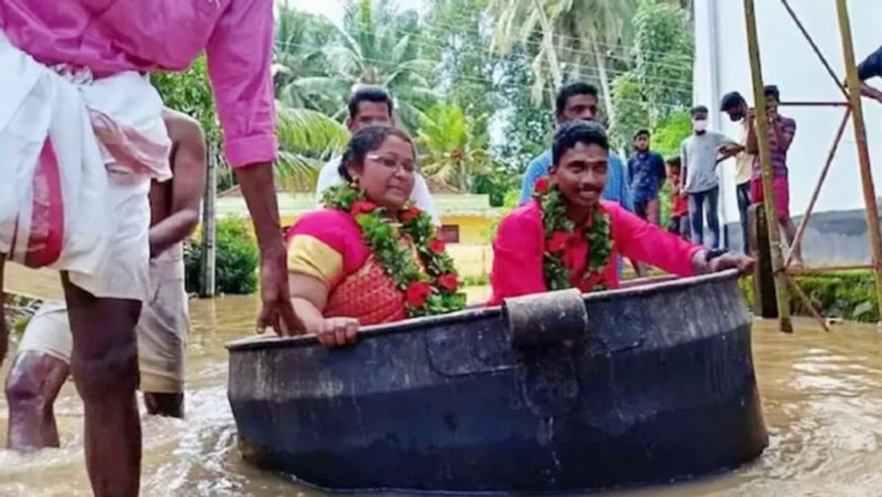 केरल में भारी बारिश और तबाही के बीच शानदार तस्वीर: दूल्हा-दुल्हन शादी करने पतीले में बैठकर मंडप तक पहुंचे