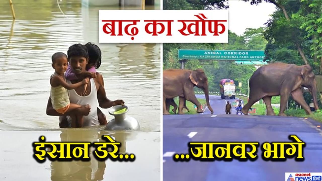 असम: अपने बच्चों के साथ सुरक्षित जगह पर जाता एक पिता। दूसरे चित्र में बाढ़ के डर से कांजीरंगा नेशनल पार्क से पलायन करते हाथी।