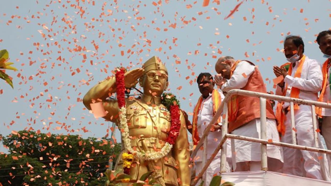 पुडुचेरी में नेताजी सुभाषचंद्र बोस की मूर्ति पर पुष्पांजलि अर्पित करते केंद्रीय गृहमंत्री अमित शाह।