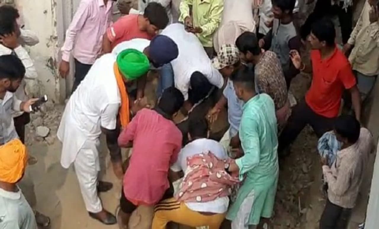 मलबे से मजदूर का शव निकालकर ले जाते हुए लोग।