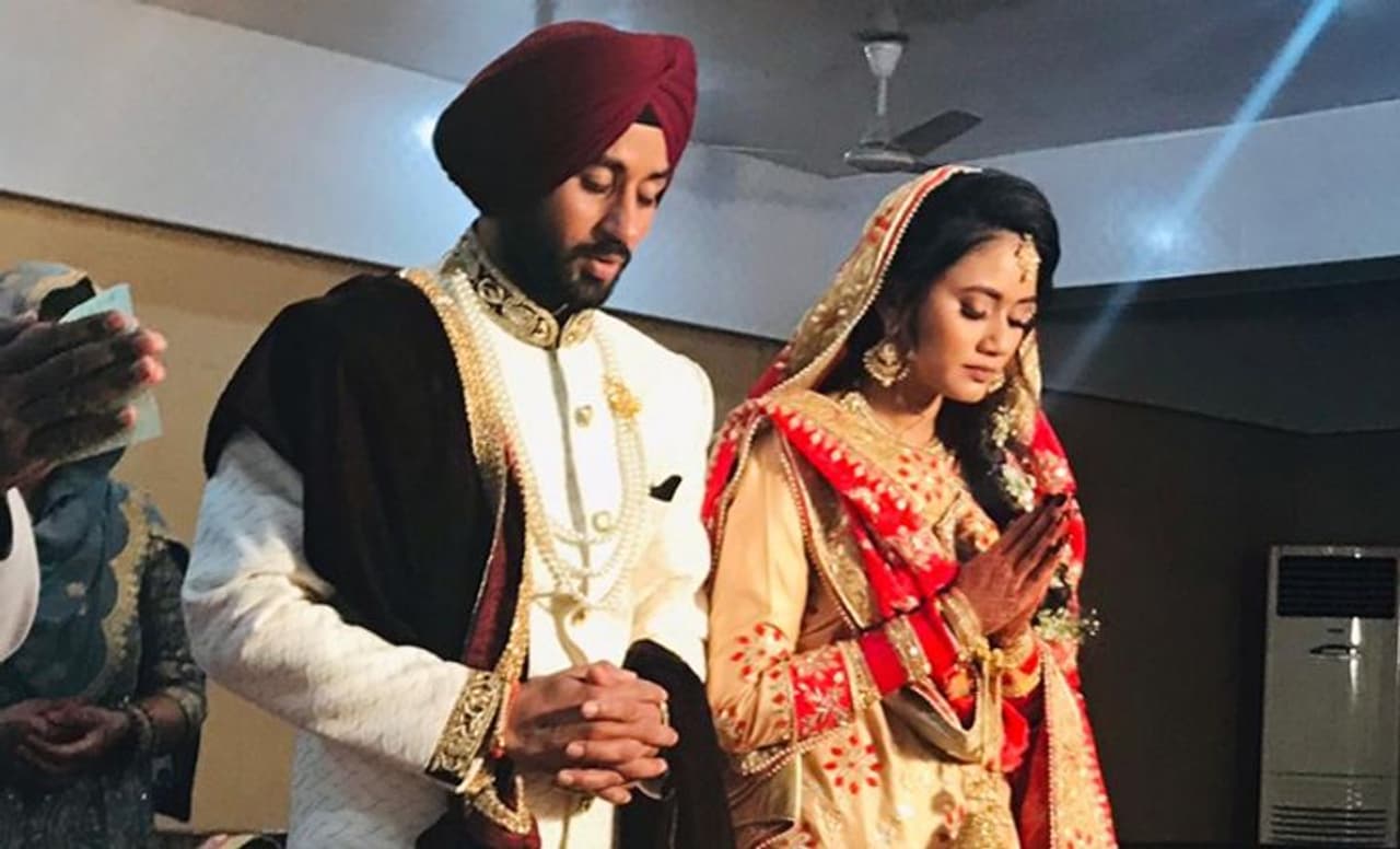 शादी के बाद गुरुद्वारे में अरदात करते हुए मनप्रीत सिंह और इली सादिक।