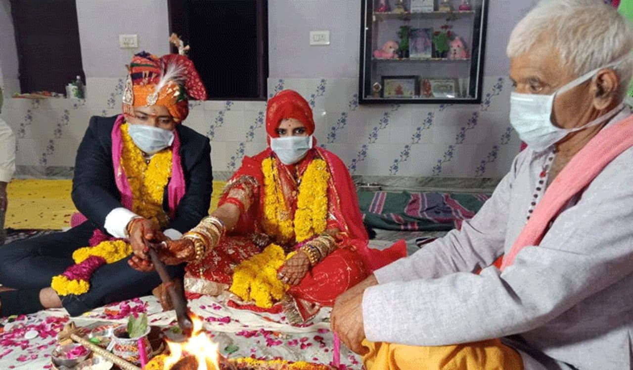 शादी की रस्मों के दौरान दूल्हा-दुल्हन मास्क लगाकर बैठे रहे।