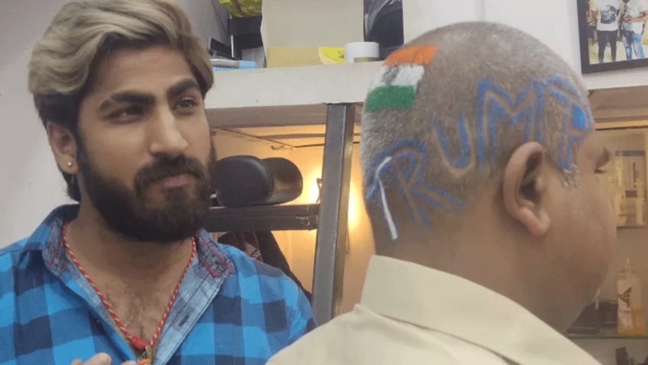 मयंक ने अपने सिर के दोनों तरफ ट्रम्म का नाम लिखवाया है।