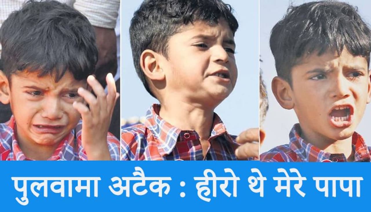 यह है कोटा जिले के सांगोद गांव के रहने वाले शहीद हेमराज मीणा का बेटा ऋषभ। पुलवामा अटैक के वक्त यह 5 साल का था। जब हेमराम की अंत्येष्टि हुई, तब मासूम पिता को याद करके फूट-फूटकर रो पड़ा। हालांकि फिर बच्चे ने खुद ही अपनी आंसू पोछे और पाकिस्तान मुर्दाबाद के नारे लगाए थे।