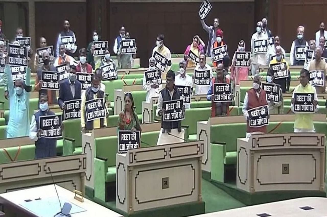 राजस्थान विधानसभा में गूंजा रीट पेपर लीक का मुद्दा, बीजेपी विधायकों ने लहराई तख्तियां, सीबीआई जांच की मांग