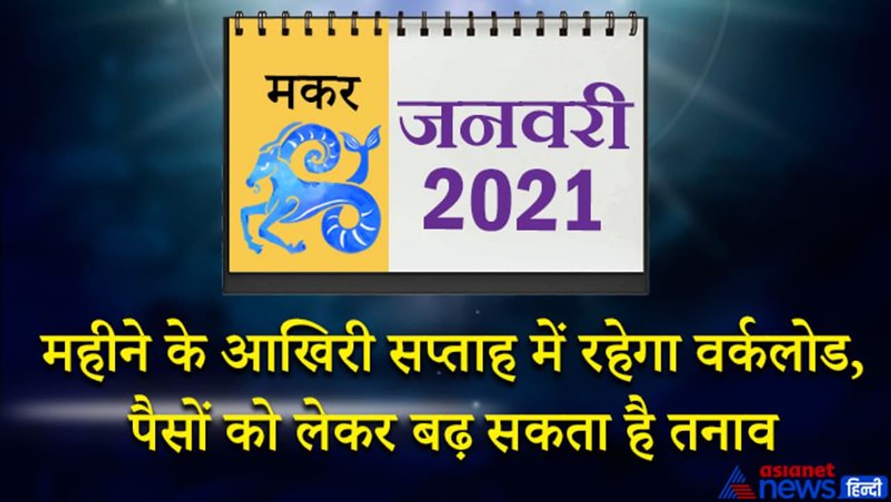 इस महीने में गुरु-शनि मकर राशि का लग्न में, मंगल मेष राशि का चौथे भाव में, राहु वृषभ राशि का पांचवें भाव में, चंद्रमा कर्क राशि का सातवें भाव में, केतु-शुक्र वृश्चिक राशि का ग्यारहवें भाव में, सूर्य-बुध धनु राशि का बारहवें भाव में रहेगा। 1 से 7 जनवरी के बीच कोर्ट से जुड़े मामले उलझ सकते हैं। भावुकता में आकर आप कोई गलत निर्णय ले सकते हैं। व्यवसाय को लेकर गंभीरता से सोचने की जरूरत है। वाहन द्वारा क्षति की संभावना बन रही है। कोई निकट का व्यक्ति आपके साथ धोखा कर सकता है। 8 से 15 जनवरी के बीच किसी अनुभवी व्यक्ति की सलाह आपके काम आ सकती है। रिश्तेदारों से संबंधों में मधुरता बढ़ेगी। बिजनेस को लेकर नए विचार आपके मन में आ सकते हैं। आता हुआ पैसा रुकने से तनाव की स्थिति बन सकती है। 16 व 17 जनवरी को मिले-जुले फल प्राप्त होंगे। आप परिवार की हर जरूरत का ध्यान रखेंगे। ससुराल पक्ष से कोई बुरी खबर सुनने को मिल सकती है। आप हर परेशानी का हल समय रहते निकाल पाएंगे। महीने के अंतिम सप्ताह में काम का दबाव ज्यादा रहेगा। आपका ध्यान अध्यात्म की ओर बढ़ सकता है।