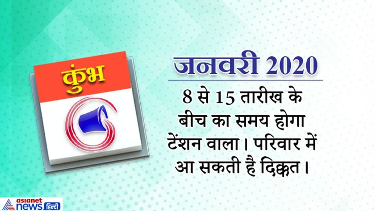 कुंभ राशिफल जनवरी 2020: इस महीने चंद्रमा कुंभ राशि का लग्न में, राहु मिथुन राशि का पांचवें भाव में, मंगल वृश्चिक राशि का दसवें भाव में, गुरु-शनि-बुध-केतु- सूर्य धनु राशि का ग्यारहवें भाव में, शुक्र मकर राशि का बारहवें भाव में रहेगा। महीने की शुरूआत में नए-नए मित्र बनेंगे। पति-पत्नी में सामंजस्य बेहतर रहेगा। इस समय पैसा तो आएगा लेकिन स्वास्थ्य में गड़बड़ी के चलते आपका मूड ऑफ हो जाएगा। परीक्षा के परिणाम आशा के अनुरूप नहीं रहेंगे। अचानक कोई पुराना रोग उभर सकता है। 8 से 15 जनवरी के बीच आप बिना वजह किसी से उलझ सकते हैं। इस समय स्थितियां आपके फेवर में नहीं है, इसलिए आपको हर फैसला सोच-समझकर लेना होगा। आपकी कोई गुप्त बात सभी को पता चल सकती है। संतान को लेकर कोई नई चिंता इस समय आपके सामने आ सकती है। विरोधी आपकी आलोचना करेंगे। लापरवाही के कारण कोई बड़ा आर्डर आपके हाथ से निकल सकता है। महीने के अंत में आप पर काम का बोझ कुछ ज्यादा ही रहेगा। परिवार का कोई बुजुर्ग सदस्य इस समय बीमार हो सकता है।