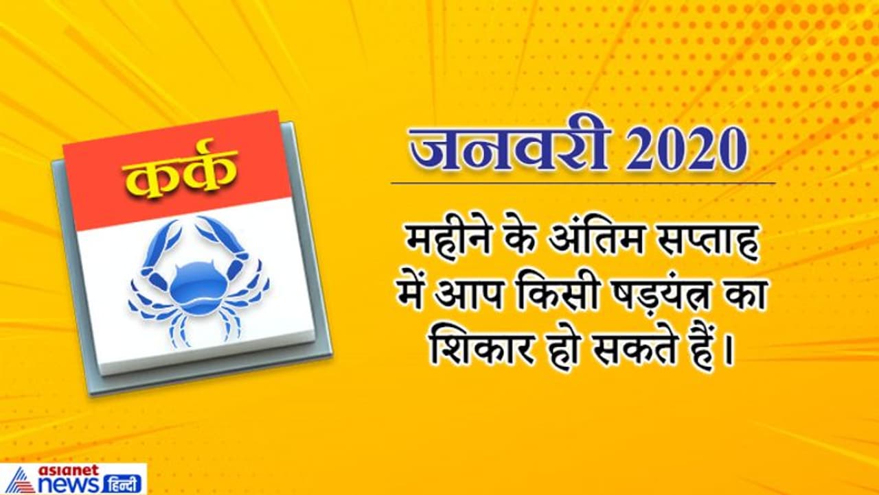 कर्क राशिफल जनवरी 2020: इस महीने मंगल वृश्चिक राशि का पांचवें भाव में, गुरु-सूर्य-शनि-केतु-बुध धनु राशि का छठें भाव में, शुक्र मकर राशि का सप्तम भाव में, चंद्रमा कुंभ राशि का आठवें भाव में, राहु मिथुन राशि का बारहवें भाव में रहेगा। साल के पहले दिन धन प्राप्ति के योग बन रहे हैं। इस महीने रोजगार के अच्छे अवसर मिलेंगे। आय के साधनों को बढ़ाने पर जोर रहेगा। पहले सप्ताह के अंत में छोटी-मोटी परेशानी हो सकती है। प्रेम प्रसंगों में तनाव की स्थिति बन सकती है। 8 जनवरी को चंद्रमा की स्थिति के कारण सफलता मिल सकती है। दूसरे सप्ताह में विद्यार्थियों को परेशानी का अनुभव होगा। पैसा कहीं अटक सकता है। 14-15 को लंबे समय से चली आ रही परेशानी का अंत हो सकता है। कोई मित्र आपकी सहायता कर सकता है। तीसरे सप्ताह में बुध की दृष्टि आप पर रहेगी, जिसके कारण आप अपनी कुशलता से सभी कामों में सफलता प्राप्त करेंगे। कोर्ट केस में स्थिति आपके पक्ष में बन सकती है। महीने के अंतिम सप्ताह में आप किसी षड़यंत्र का शिकार हो सकते हैं। बदनामी भी हो सकती है। इस समय थोड़ा संभलकर रहें।
