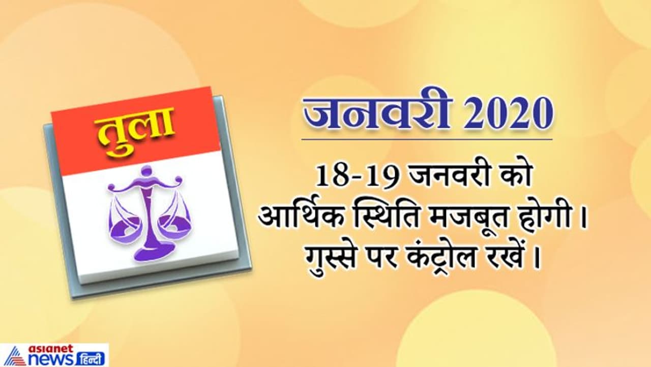 तुला राशिफल जनवरी 2020: इस महीने मंगल वृश्चिक राशि का दूसरे भाव में, शनि-गुरु-बुध-केतु-सूर्य धनु राशि का तीसरे भाव में, शुक्र मकर राशि का चौथे भाव में, राहु मिथुन राशि का नौवें भाव में रहेगा। महीने का पहला सप्ताह शुभ रहेगा। आप इस समय प्रसन्नचित्त महसूस करेंगे। आपकी कार्ययोजना सफल हो सकती है। नौकरी में भी प्रमोशन के योग इस सप्ताह बन रहे हैं। संतान की ओर से भी संतुष्टि का भाव रहेगा। महीने का दूसरा सप्ताह ठीक नहीं है। परिवार के हितों के लिए आप कोई जोखिमभरा निर्णय ले सकते हैं। ये समय काफी व्यस्त रहेगा। 14-15 को मेहनत का पूरा फल मिलेगा। सारी बाधाओं को दूर करते हुए आप आगे बढ़ते जाएंगे। 18-19 जनवरी को आर्थिक स्थिति मजबूत होगी। इस समय आपको कोई शुभ समाचार भी मिल सकता है। प्रेम प्रसंगों में भी सफलता मिल सकती है। सप्ताह का अंतिम समय मनोरंजन में व्यतीत होगा। महीने के अंतिम सप्ताह में नौकरी में कोई गड़बड़ी हो सकती है। जिसके कारण बॉस डांट सुननी पड़ सकती है। इस समय सिरदर्द और मौसमी बीमारियों का प्रकोप रहेगा। क्रोध व वाणी पर नियंत्रण रखें।