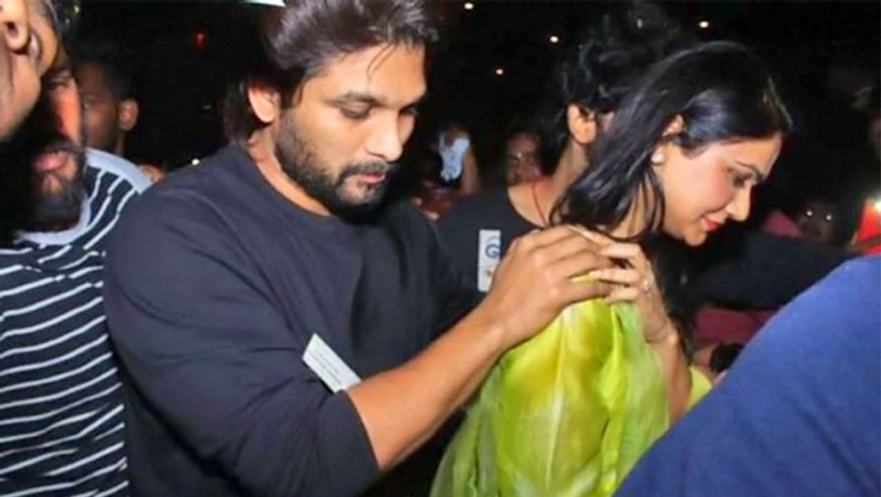 मुंबई/हैदराबाद। साउथ के मोस्ट स्टाइलिश एक्टर अल्लु अर्जुन की फिल्म 'अला वैकुंठपुरमुलू' 12 जनवरी को रिलीज हुई। फिल्म में अल्लु के साथ एक्ट्रेस पूजा हेगड़े भी हैं। रविवार को हैदराबाद में अल्लु अर्जुन पत्नी स्नेहा रेड्डी के साथ खुद अपनी फिल्म का फर्स्ट डे फर्स्ट शो देखने पहुंचे। इस दौरान अपने चहेते स्टार की एक झलक पाने के लिए सिनेमा हॉल के बाहर लोगों की भारी भीड़ जमा थी। ऐसे में अल्लु अर्जुन वाइफ स्नेहा को भीड़ से प्रोटेक्ट करते नजर आए। अल्लु ने वाइफ के कंधे पर हाथ रखा और उनके पीछे-पीछे किसी गार्ड की तरह चलते दिखे। बाद में अर्जुन ने पत्नी के साथ थिएटर में फिल्म देखी।