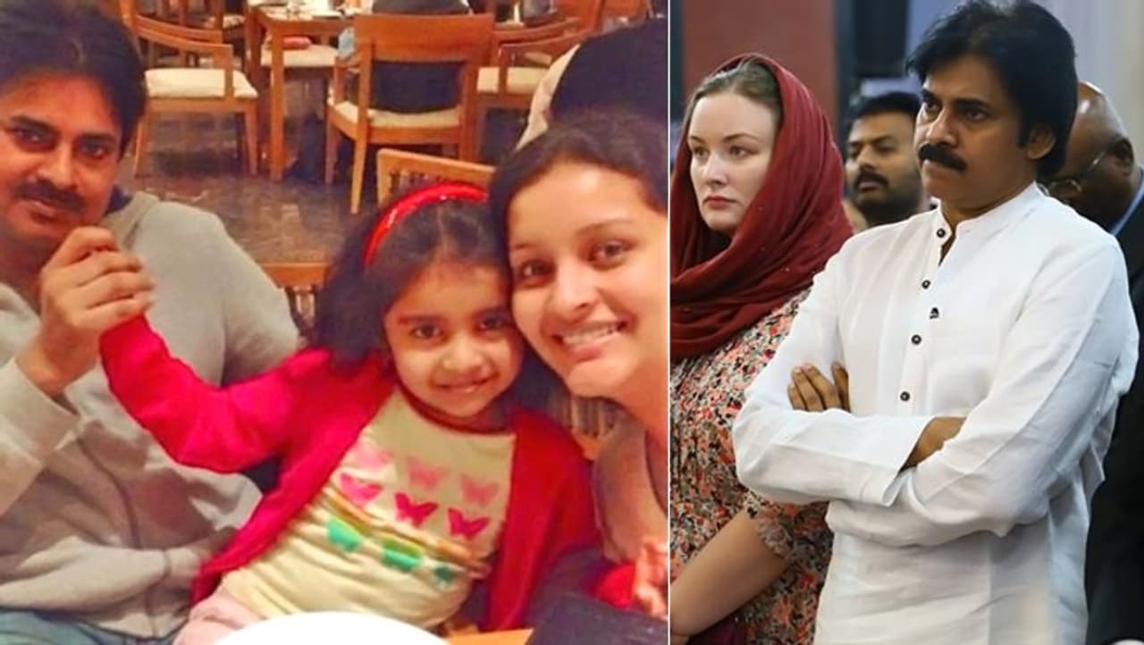 दूसरी पत्नी रेनू देसाई और बेटी आध्या के साथ पवन कल्याण। दूसरी ओर तीसरी पत्नी अन्ना लेजनेवा के साथ पावर स्टार पवन कल्याण।